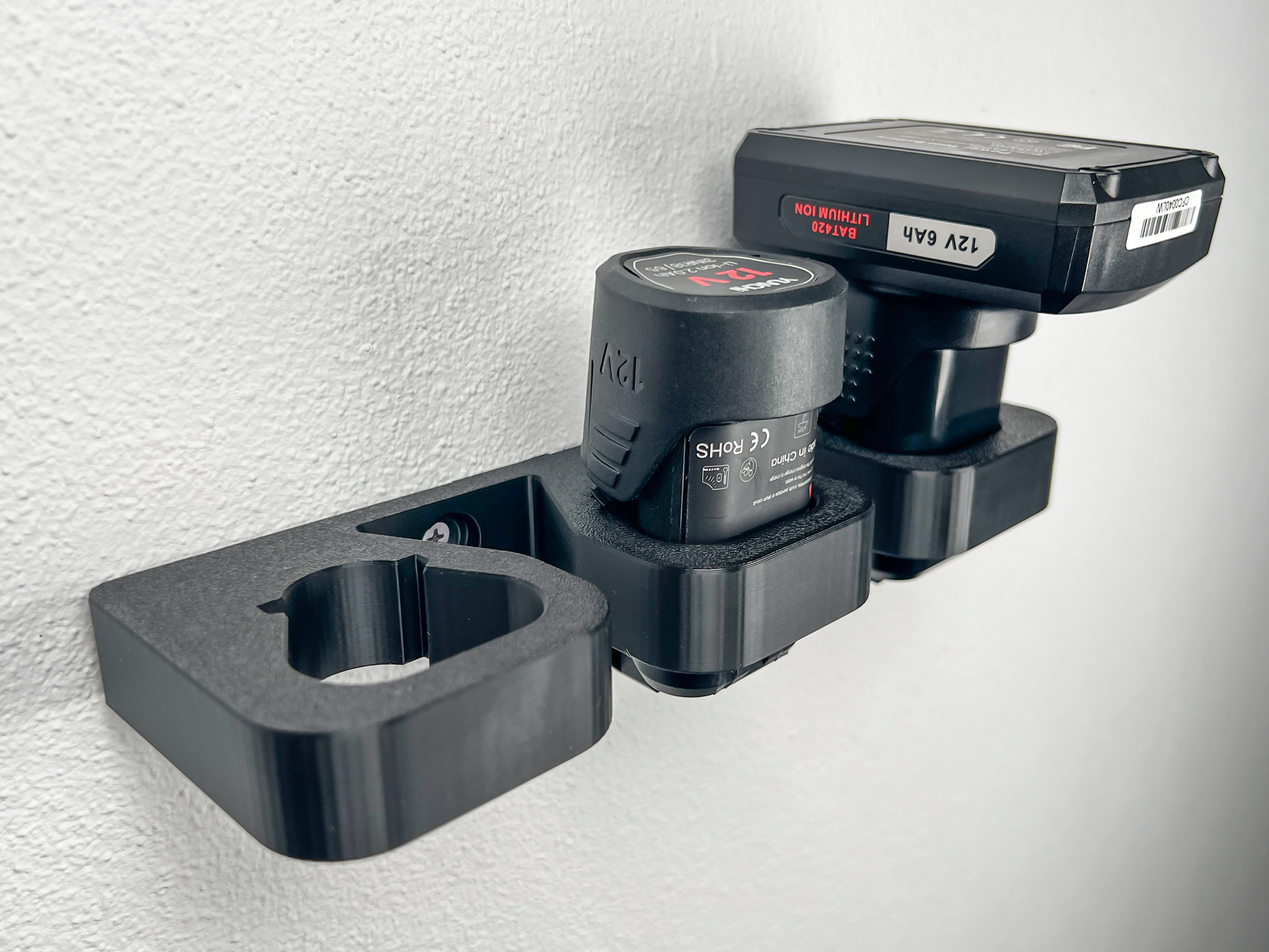 Keep your Bosch 12V batteries neatly stored and always ready with the Decoralin Wall Mount Battery Holder. Designed for both Bosch Professional (GBA) and Home & Garden (BAT) series, this holder fits perfectly with Bosch 12V power tool batteries, no matter if you use the blue professional line or the green DIY line. The mount securely stores up to 3 Bosch 12V batteries and is ideal for workshops, garages, or utility rooms. Installation is quick and reliable using the included 2 screws and 2 wall plugs. Once fixed, the holder provides a precise fit that keeps your batteries safe yet easy to access. Made in Europe from durable black plastic, this holder is built to last while keeping your workspace organized.